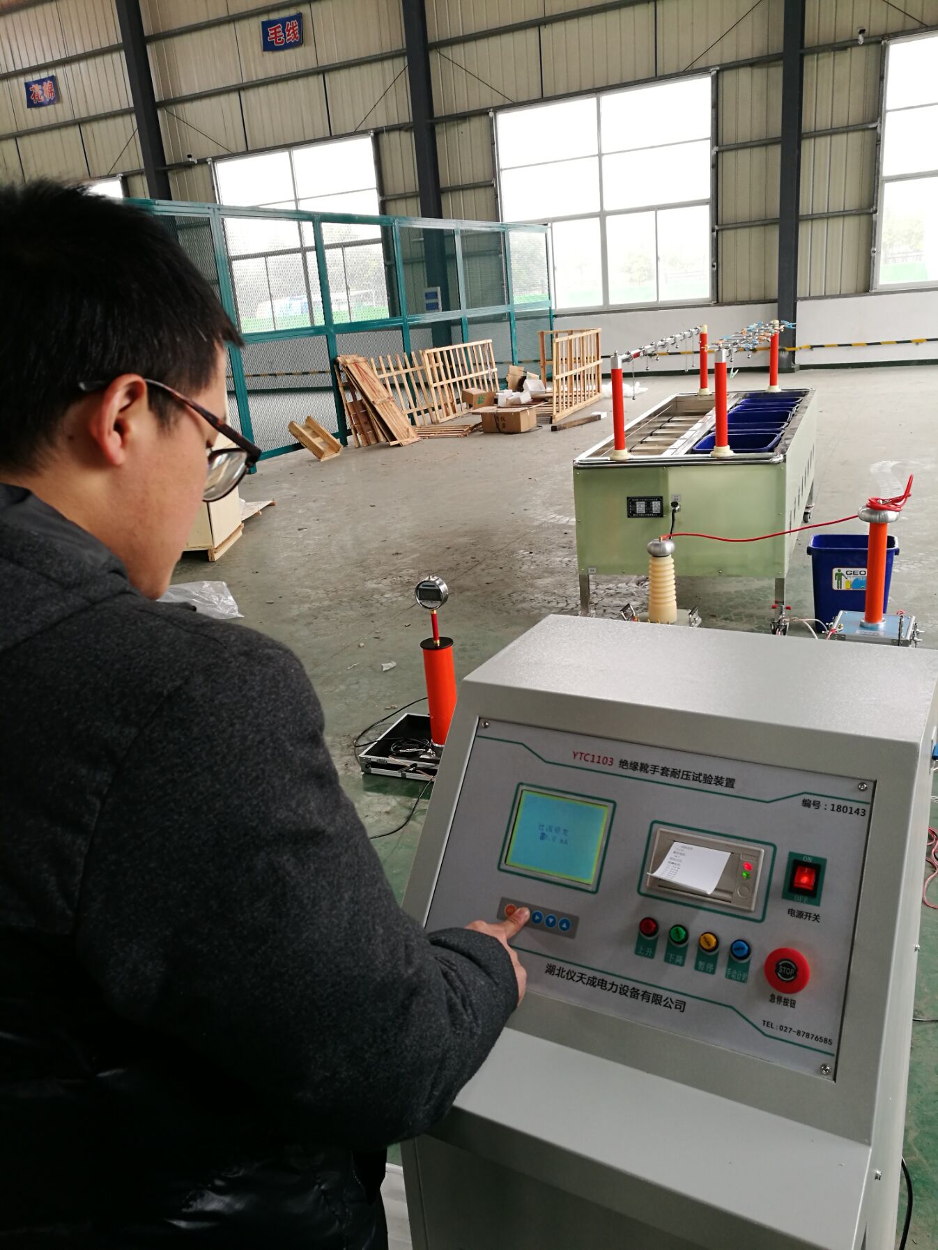 此次培訓的主要設備是我公司的產品:YTC1103絕緣靴手套耐壓試驗裝置,該試驗裝置是絕緣靴(手套)批量試驗的專用設備。也可以對安全工器具進行測試,是我公司根據絕緣靴(手套)的試驗要求,并遵從廣大用戶意見而設計生產的。該產品有效的解決了過去不規范試驗,提高了工作效率、保障了工作安全,是理想的絕緣靴(手套)專用設備。該產品采用先進的微電子處理技術,全部使用過程可提前進行設置,全中文界面,操作簡單明了。全部測試項目設定后自動進行測試,無須人工干預。